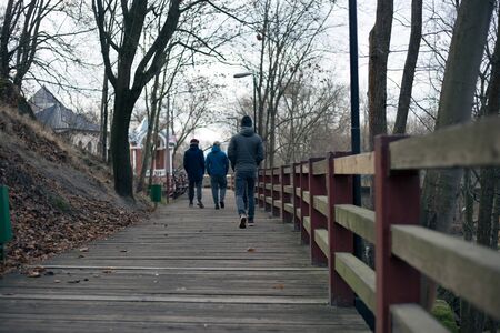 two people back to camera walking on pawement road in park weekend rest spending