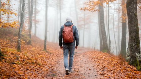 A lone hiker walks along a damp, leaf-strewn path deep within a foggy forest.