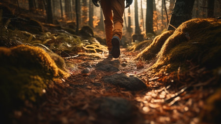 Walking along a scenic trail covered in autumn leaves during sunset in a peaceful forest setting. Generative AI