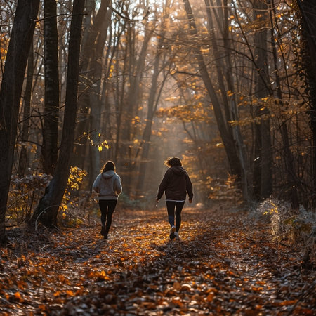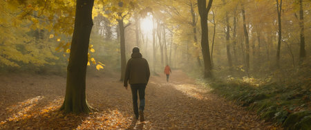 Two individuals are seen walking along a sunlit path through a forest. The ground is covered in fallen leaves, indicating autumn. The scene is peaceful and serene, highlighting the beauty of nature.