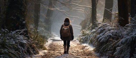 Photo of a lone hiker, a woman walking through a snow-covered forest, her figure enveloped in fog. The image captures the essence of solitude and the stark beauty of nature in winter, with trees lining a cold, misty path.