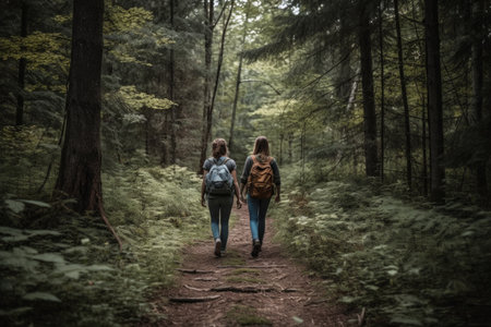tired girls travelers with backpacks go through thicket in the forest. Hiker woman walks in the forest. happy hiker girl in summer park. teenager girl adventures on vacation.