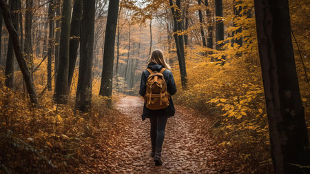 laura strides confidently along the winding autumn forest trail, surrounded by vibrant orange and yellow leaves that crunch beneath her feet, as the warm sunlight filters through the trees, casting a serene ambiance on this picturesque fall scenery. ai generated