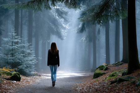 A person strolls along a winding path in a tranquil forest surrounded by tall trees and soft mist.