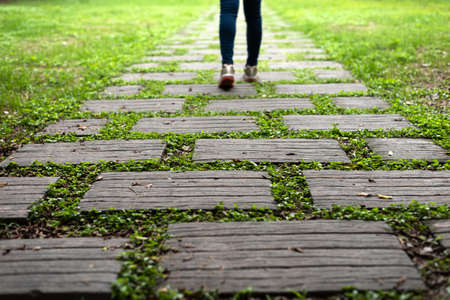A person walks on a paved path with painted 'walk' signage. The image displays a close-up of the feet and lower legs, showing sneakers and the path's text. The composition focuses on forward direction, with an out-of-focus background hinting at an outdoor setting. This image may be suitable for illustrating concepts of activity, exercise, or lifestyle.