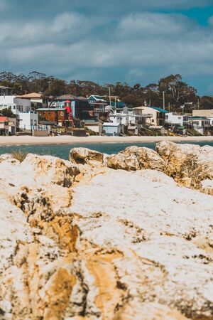 sunny Australian beach in Cremorne, Tasmania looking beautiful and deserted in winter