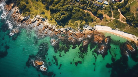 Aerial view of idyllic tropical coastline, with transparent blue water generated by artificial intelligence