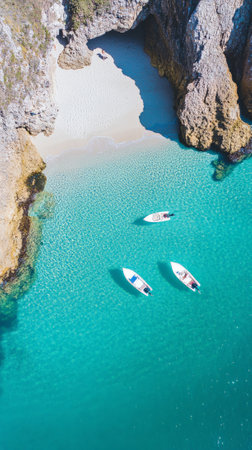 Three motorboats are floating on incredibly turquoise water near a white sand beach hidden in a cove surrounded by cliffs, creating a breathtaking tropical paradise scene