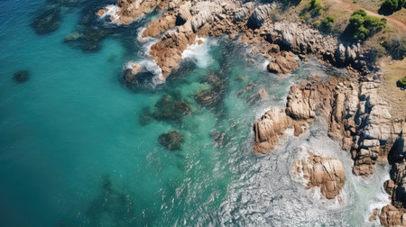 Drone capture of a rugged shoreline and sparkling sea, showcasing a summer destination with vibrant coastal landscapes.