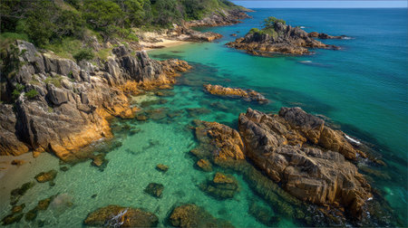This image showcases a coastal landscape with rocky formations and clear turquoise waters. The scene features a combination of green vegetation, brown rocks, and blue water. The composition, likely captured during the daytime, offers a striking visual, suitable for various commercial and editorial applications.