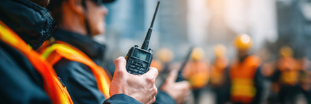 Colleagues collaborate effectively as a man communicates via a walkie-talkie on a busy construction site filled with safety-equipped workers in the background.