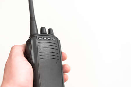 Close up male hand civil engineer holding radio walkie talkie standing in studio isolated white background.