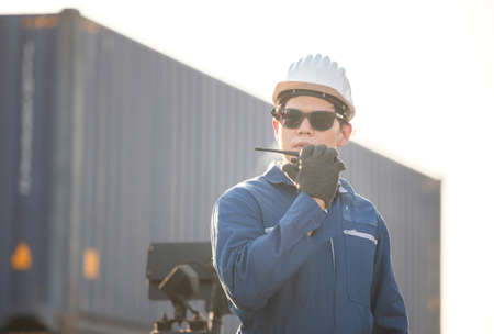 Engineer worker or technical standing in the container yard shipping area and used radio communication to control loading containers into the stack. Industrial and import-export concept