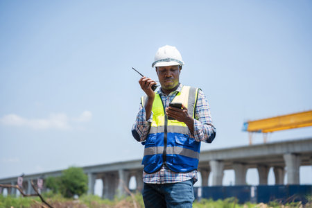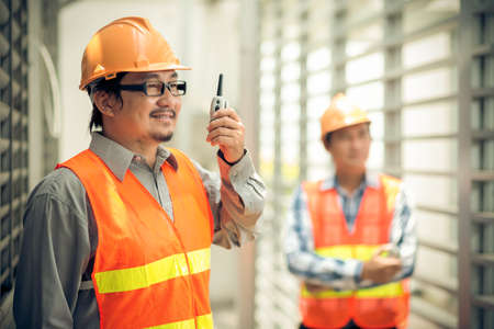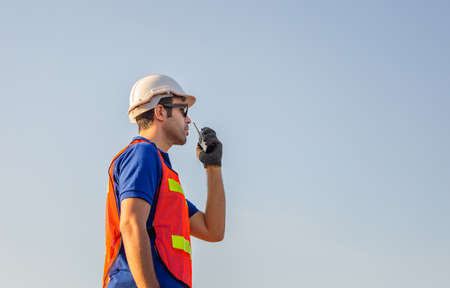 Engineer using walkie talkie and talking about work construction site. talking by walkie talkie control and communicate with worker. Contractor man using radio operation in industry.