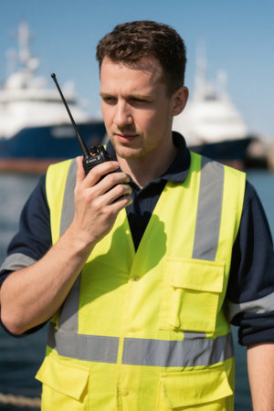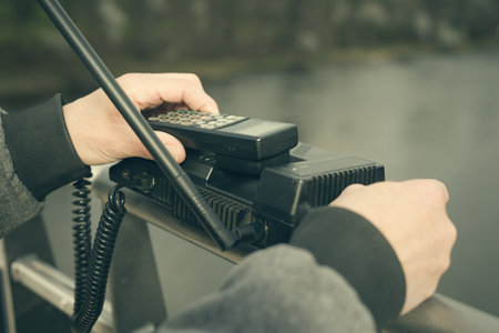 Marine Deck Officer or Chief mate on deck of ship with VHF radio