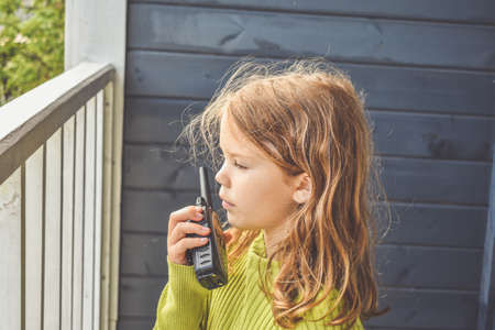 a girl child is talking on the radio on a sunny summer day