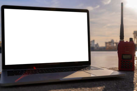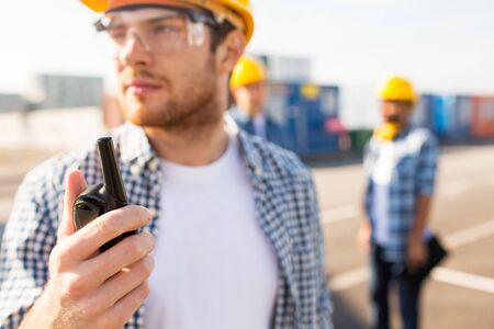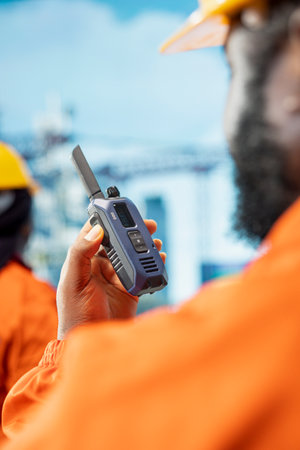 closeup worker using ham radio for operation control in cargo port shipping