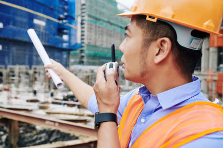 Contractor using walkie-talkie for communication with other workers when managing processes at construction site