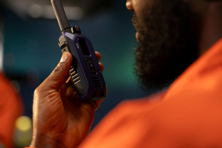 Close up of black engineer speaking via walkie talkie with colleagues from drilling rig, monitoring oil extraction activity for efficiency. Trying to minimize carbon footprint levels on platform.