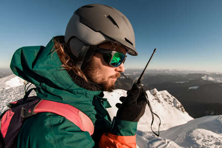 Side view on head of man in ski helmet with walkie-talkie in his hand