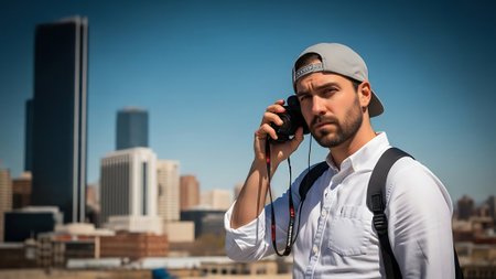 A joyful photographer enjoys the urban landscape while capturing moments in rainy weather. The city skyline and passing train add to the dynamic atmosphere.