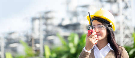 Engineers woman holding radio, blueprint and report schedule for workers security control at power plant energy industry. Engineer and industryConcept, copy space for banner
