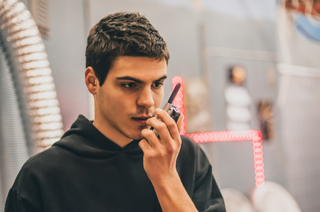 The young man is holding a radio transmitter in his hand on a white background. Walkie-talkie.