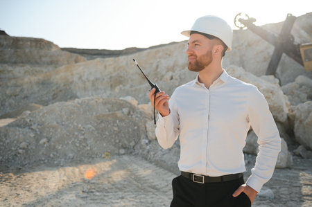 Worker in hardhat standing in stone quarry.