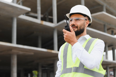 Male engineer or architect wearing a hard hat, safety vest, and glasses, using a walkie talkie at a building construction site