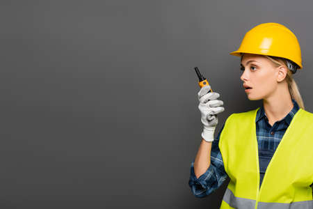 Blonde builder in glove and safety vest using walkie talkie isolated on grey