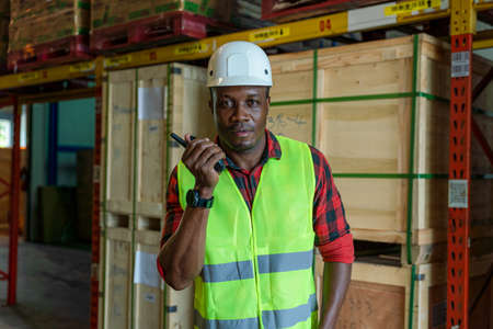 portrait of african american male factory warehouse foreman with safety vest and helmet working and using communication radio in storage warehouse of logistics business