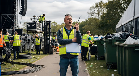 An event manager in a yellow safety vest holds a walkie-talkie while overseeing a team setting up or cleaning up an outdoor festival. In the background, crew members are moving equipment, including a forklift and chairs, conveying themes of organization, teamwork, and event production.