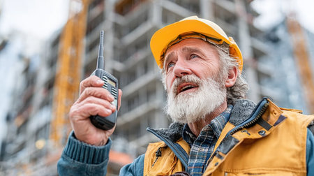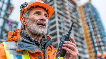 A senior construction worker engages in communication using a walkie-talkie on a bustling building site. The project features unfinished structures and showcases the essence of teamwork in the construction industry.