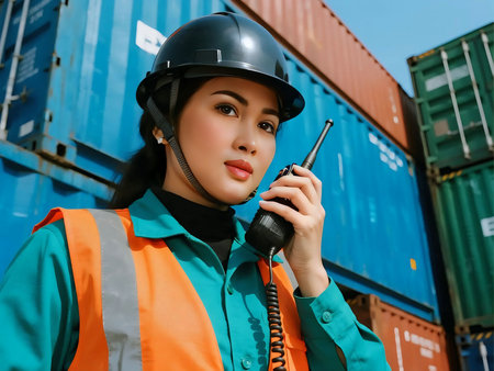 Asian female worker wearing safety helmet and reflective vest using walkie talkie at container yard. Concept of logistics, shipping, transportation, occupational safety asian, teamwork, and industry.