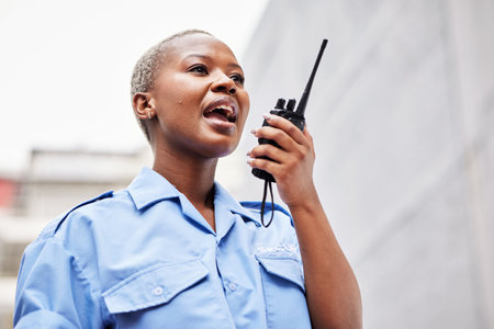 Walkie talkie, woman and security guard with radio outdoor for safety, justice and call backup. Black female police officer, bodyguard and contact audio communication for crime watch and surveillance