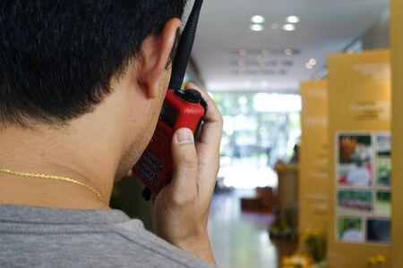 Man with a Walkie Talkie or Portable radio transceiver for communication at event