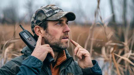 Man in Camouflage Clothing Using Walkie talkie in a Winter Wetland Setting, Outdoor Communication Concept AI Generative