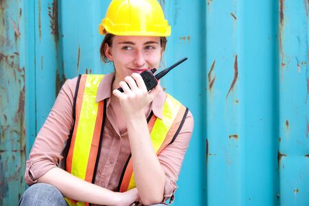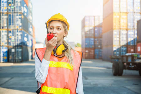 Pretty engineer worker using walkie talkie to control loading containers in the container cargo shipping area. Industrial Container for import and export. Happy work. Shipping and logistic concept