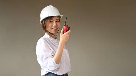 Attractive young Asian female engineer or architect in white safety helmet using a walkie talkie in the construction site.