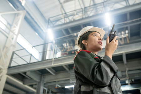 Young female engineer in protective helmet and workwear using walkie talkie
