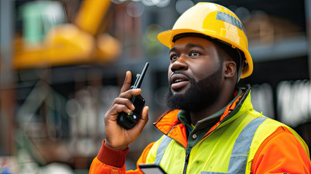 Construction worker using a walkie-talkie for efficient project management. Stay connected with 5G tech for seamless industrial updates.