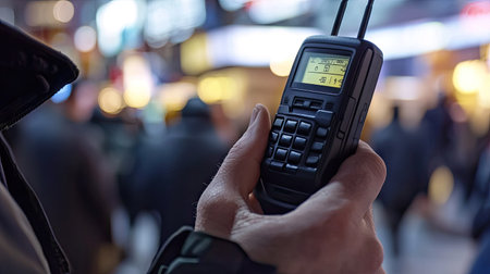 A hand holding a walkie-talkie up close, with fingers on the talk button, set in a professional setting for efficient communication.