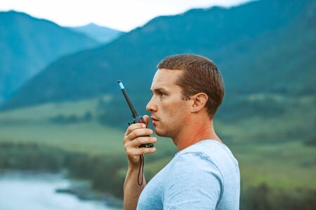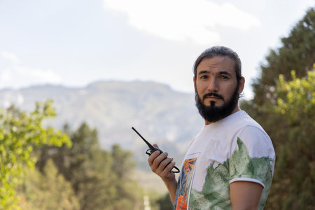 Portrait of man stands in the wilderness, holding a walkie-talkie. Copy space for text