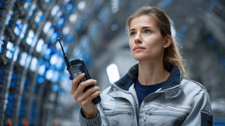 female site manager confidently holds a portable radio, embodying leadership and communication on the job site. Her poised demeanor symbolizes empowerment and teamwork in construction
