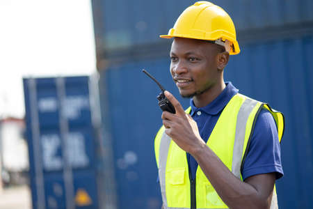 American African engineer or factory worker man working at Container cargo harbor to loading containers. African dock male staff for Logistics import export shipping concept.