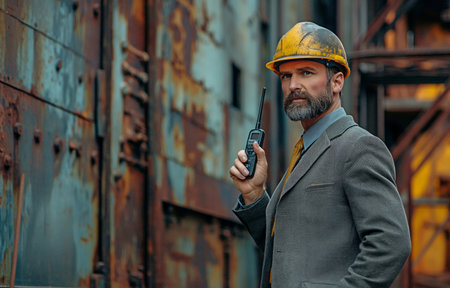 Full body photo of a suit-clad, helmet-wearing, European male engineer who owns a factory and is holding a walkie-talkie.