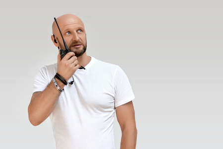 A security guard with a walkie-talkie, a bald 40-year-old man talking on a walkie-talkie, isolate