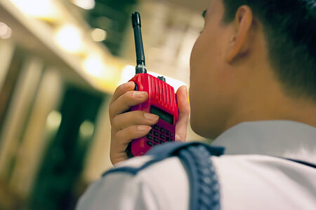 The male hand holding with a red Walkie Talkie or Portable radio transceiver for communication.