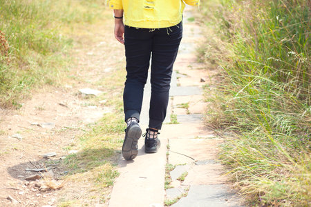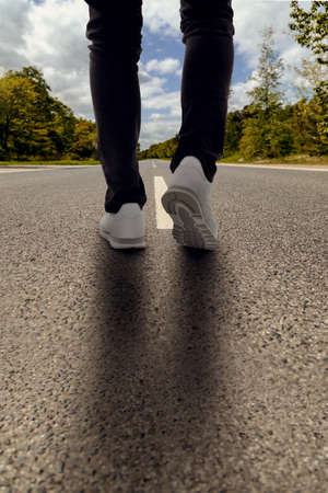 Legs of a man walking on an asphalt road. Walking.