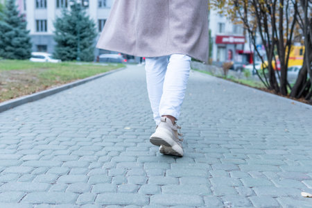 Close-up of a person walking on asphalt road in white sneakers and jeans, symbolizing progress, lifestyle journey, healthy activity, and determination toward future goals in everyday life concept.
